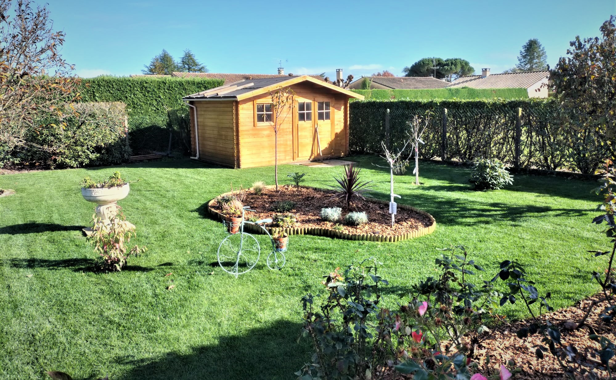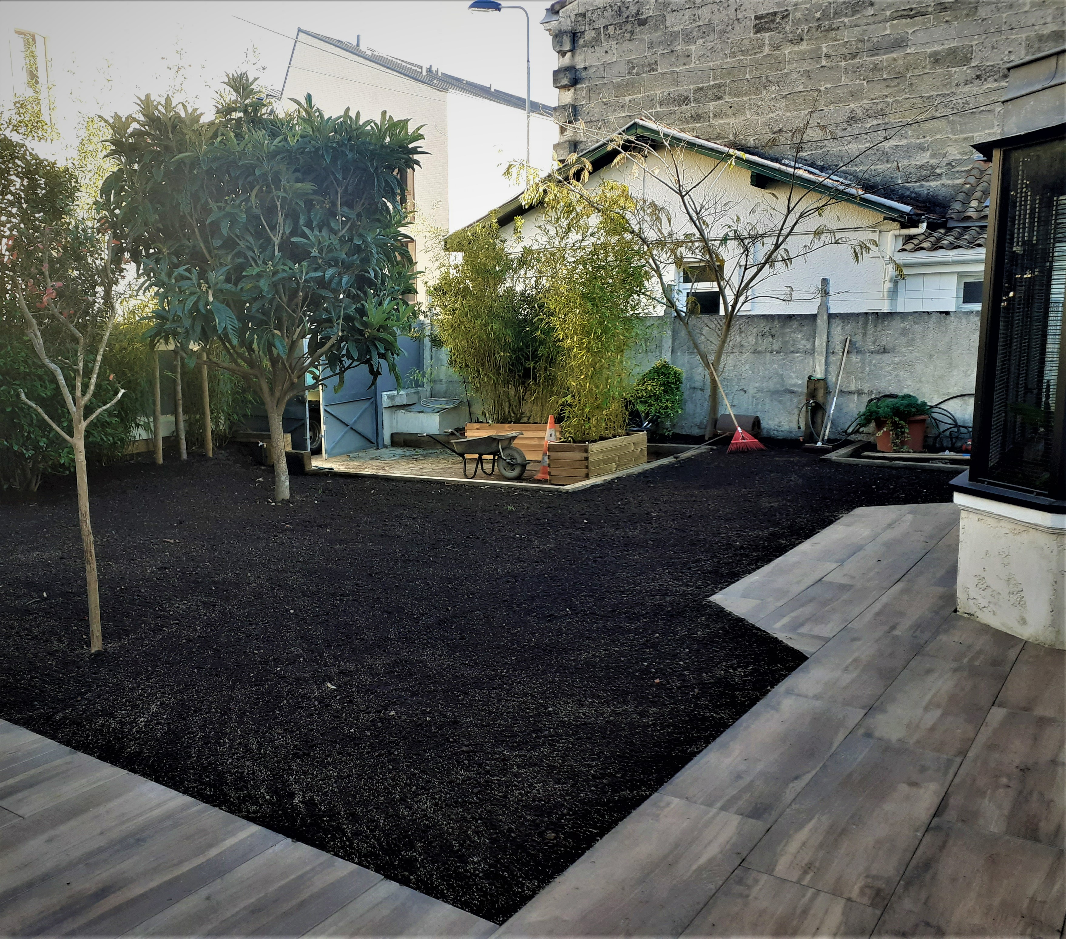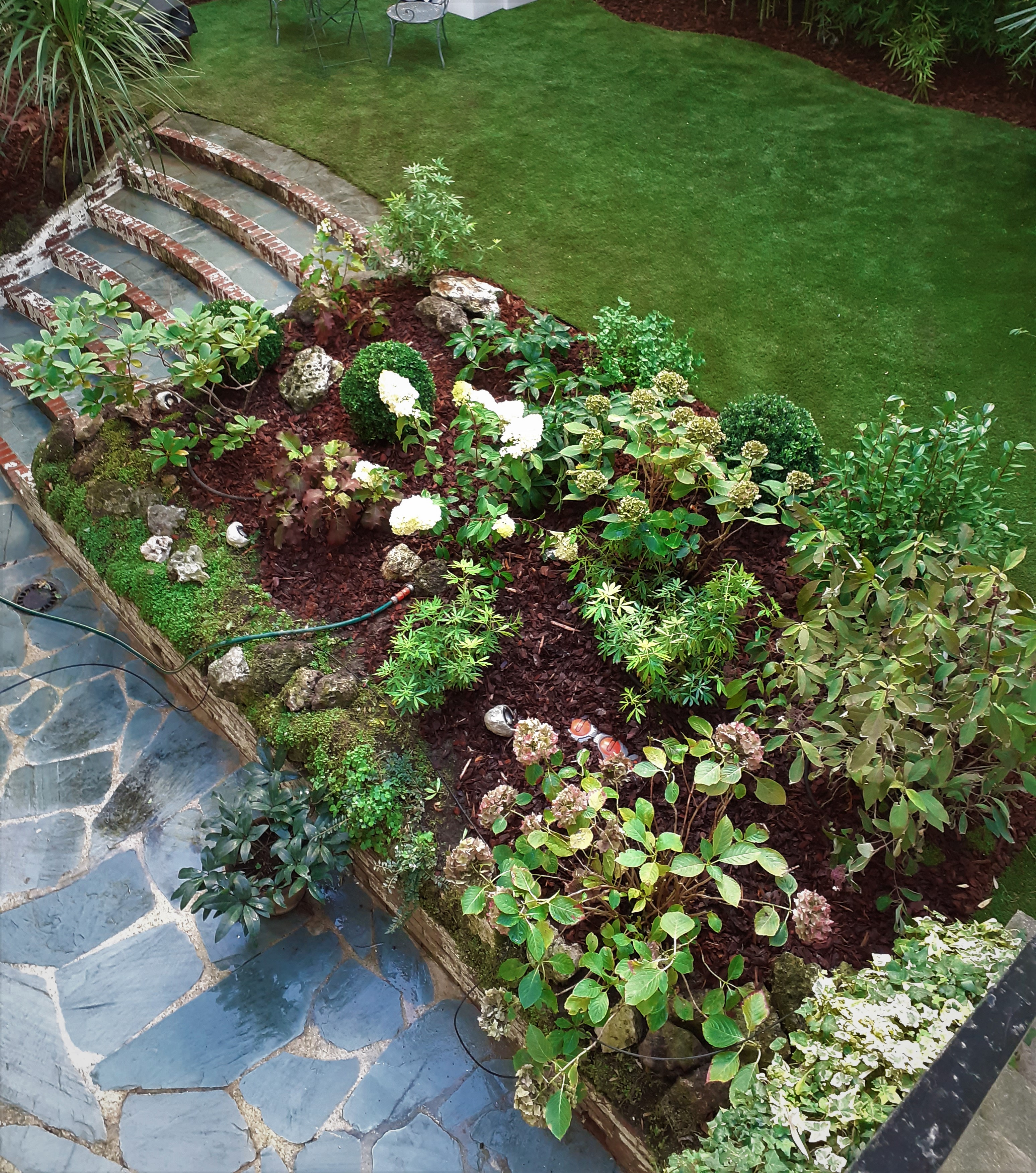 Terrassement, pose de bordures en acier, apport de terre et de copeaux. Pose d’un arrosage automatique intégré et mise en place d’un gazon de placage.