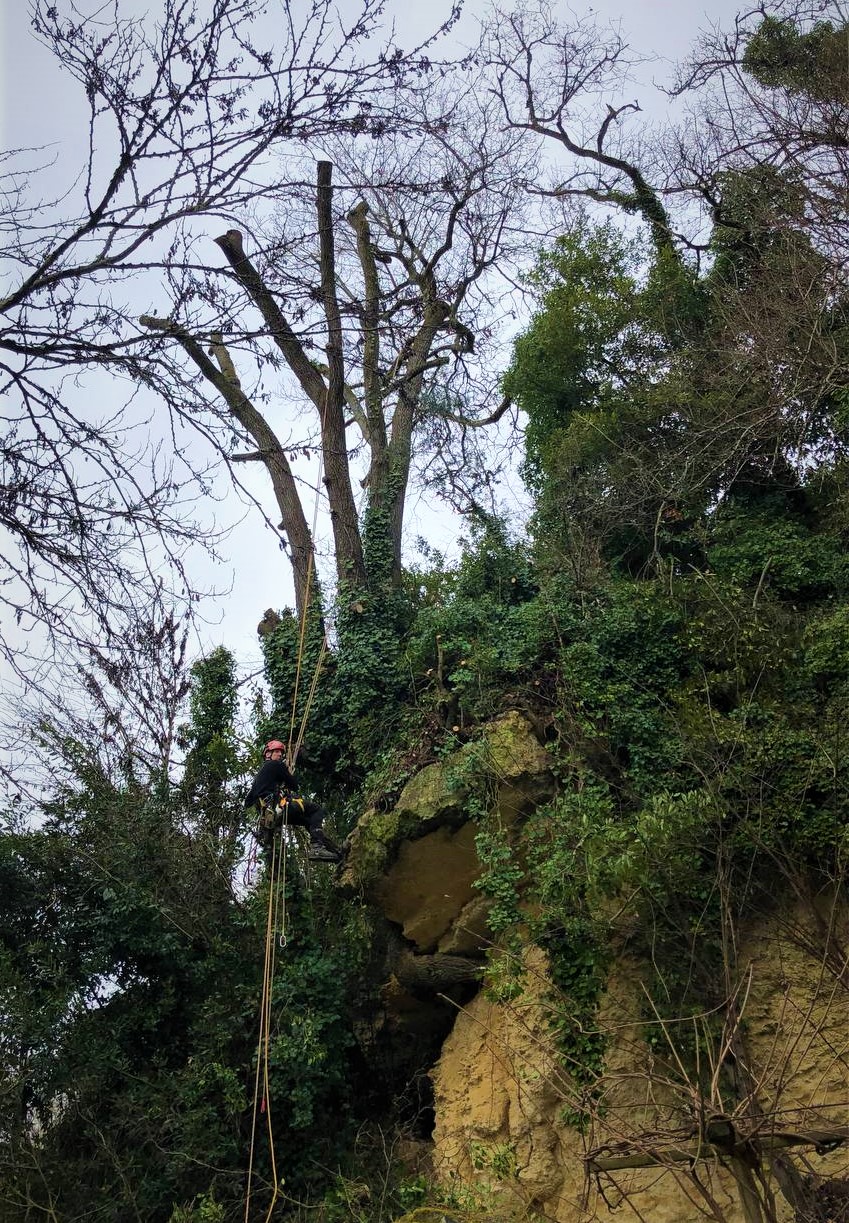 Taille et entretien aux abords de la falaise surplombant Cambes et abritant un ermitage fondé au XVIème siècle